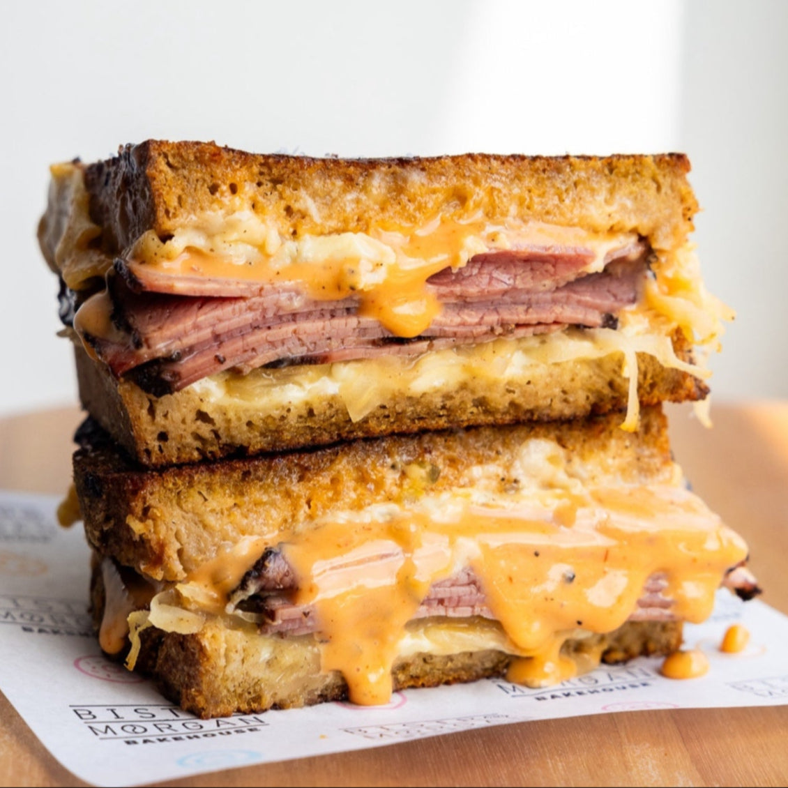 slow cooked beef brisket, double Swiss cheese, sauerkraut and Russian dressing on toasted light rye